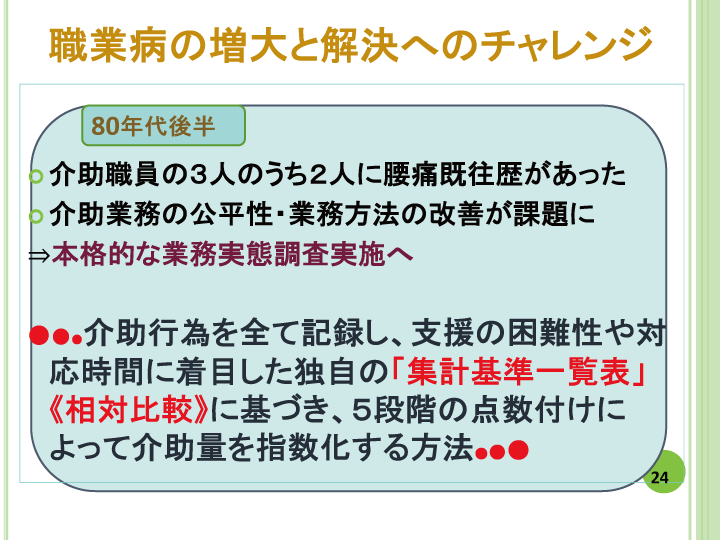 23 80年代後半から90年代始めにかけて、業務の公平性に関する課題を検討しました。介助業務量に偏りがあると特定の職員に負担が蓄積され腰痛等で休むことになる。そのことがまた他の職員への負担に波及し、悪循環となることが当園の施設運営の中ではしばしば確認されています。特に夏場、冬場、梅雨時、世の中の景気が良くて施設に人材が集まらなかったとき等はてき面です。そのため、各人の業務量を比較しやすいように「ケア行為ごとの業務量を数値化できないか」というのが最初の問題意識でした。介助業務量・業務密度の数値化については、タイムスタディ調査を外部に任せると何百万円もの費用がかかります。加えて、職員が付いて観察すると膨大な人数が必要となり不可能です。しかも、仮にそれを実行して業務の合計時間が分かっても職業病などに関わる業務量がすぐに分かるわけではなく分析に手間がかかってしまいます。そこで考え出したのが、介助内容を可能な限り拾い出し、項目ごとに支援の負荷や困難性、対応時間を総合した5段階の点数表の作成です。これを使って、職員が介助業務中に利用者の誰にどのような介助を行ったかを網羅してもらうことにしたわけです。実際の運用では、部分的な記入漏れがあっても、そこは利用者の生活パターンを知るベテラン職員が厳密にチェックし、記入者へのヒヤリングなどで修正する。想定しない介助内容も類似した項目との比較で慎重に点数を割り出しました。最初は、入浴日が限定されていたので1週間の調査を行い分析に時間を要しましたが、30分単位・24時間の男女フロア別介助業務量と密度の指数を求めることができました。その後、精度に自信が持てるようになってからは、3日間、1日間と、調査期間を短縮しても実態把握は可能となりました。