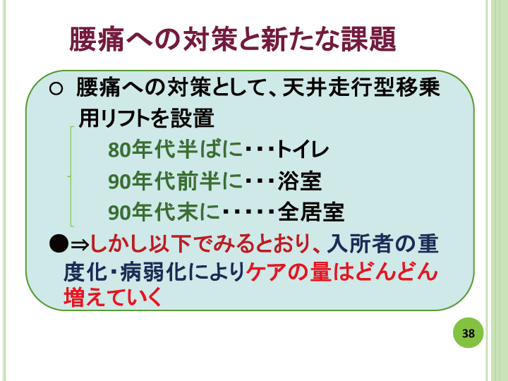 37 そして、腰痛など職業病対策に力を発揮したのが、天井走行リフトです。最初に導入したのはトイレで30年近く前になります。その後浴室、居室へと年月を掛けて設置してきました。しかしケア量はどんどん増加していきます。