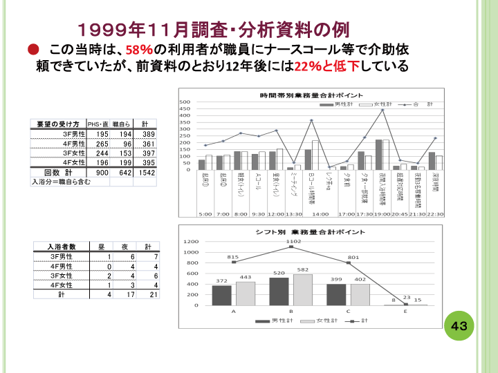 42 これも2011年調査データの一部です。総介助件数のうち職員判断の対応が78%と8割近くになっていることから、支援する職員は、完全に支援動線を頭に描いていなければなりません。3階女性(利用者14人)の18:00~20:00の業務量が極端に高くなっています。これは、当時の3階女性職員のメンタルヘルス調査結果(ストレス度点数の高さ)とも符合します。