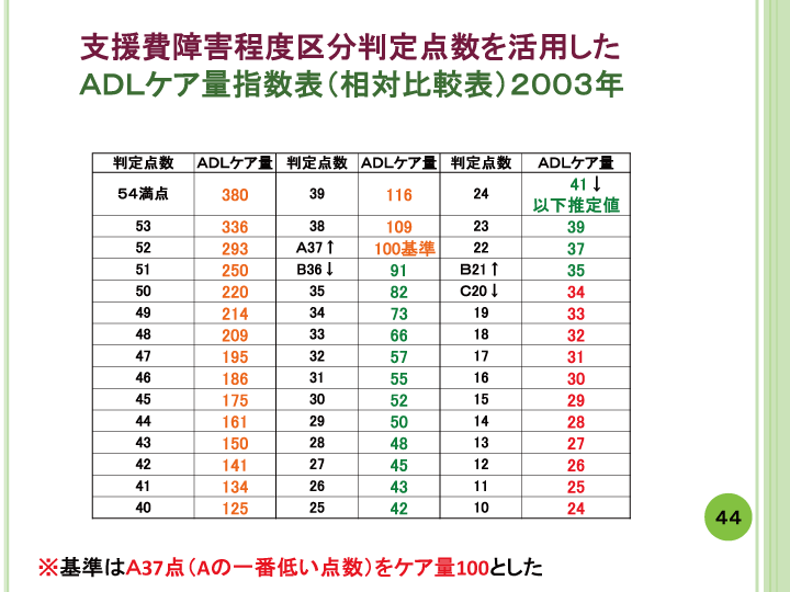 44 これまで見てきた全体のケア量調査は、他方で個人別ケア量もわかるようになります。個人別ケア量指数を点グラフで分布させ、2003年の支援費障害程度区分判定点数(記憶されている方もいらっしゃると思いますが、54点が満点のABC判定です)と合わせてみました。すると、相関関係が指数の平均値では見事に連動し一致します。区分点数間のケア量逆転はありませんでした。しかも、障害程度区分判定点数が50点位から上に行くと、幾何級数的に介助量は跳ね上がることがわかりました。これは、上限に近くなると重度の身体障害に加え、認知に障害がある利用者が増えて介助をさせてもらえない等の支援の困難性が高まり、医療的ケア状況も多くなるからです。この表のADLケア量は当園の1999年時点の支援実態を基に指数化し基準としています。点数の低いケースのケア量はあくまで推定です。