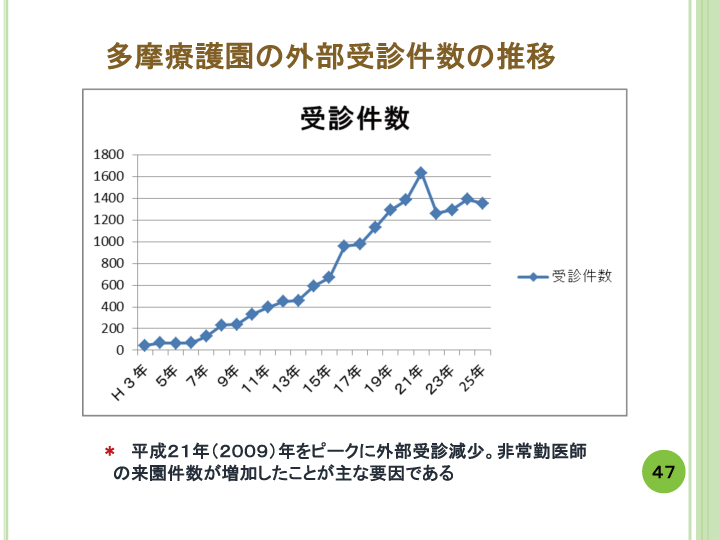 47 当園の外部医療機関受信件数の推移です。非常勤医師の診療増加がここ数年効果を発揮しています。