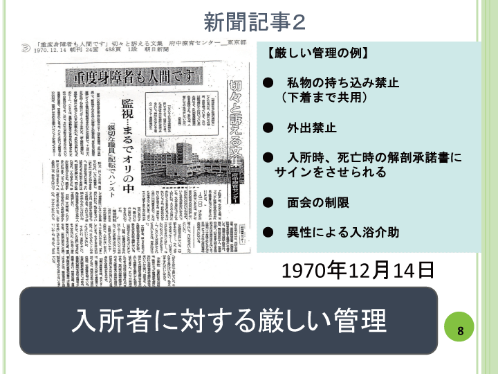 6 都立府中療育センターは1968年に東京都の肝いりで建てられました。当初は重症心身障害児(者)【今は特別支援学校などで重度・重複障害児(者)と言っていますが】を受入れる施設を予定していました。しかし、途中から住民の反対で施設建設の進まない重度身障や重度知的の障害者も受け入れる方針となりました。これが、医療管理と生活権めぐる争いの基となったとも言えます。